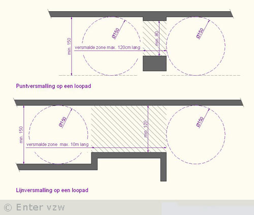 Daarnaast staat in de artikels met betrekking tot de gangen en looppaden (art. 14 en 15) letterlijk de mogelijkheid beschreven om binnen bepaalde grenzen ontwerpmatig versmallingen op te nemen. Deze versmallingen mogen standaard opgenomen worden in het ontwerp zonder een afwijking te moeten aanvragen aangezien dit een normopvolging is.