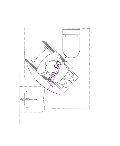Aan de voorzijde van de toiletpot is een vrije ruimte van min. 120cm diep, gemeten vanaf de voorzijde van de toiletpot tot aan de tegenoverliggende wand of het sanitair toestel, zodat het ook mogelijk is om een voorwaartse transfer te maken.