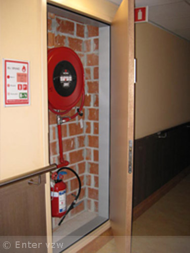 Hangende elementen die niet voelbaar zijn op vloerniveau (bv. brandhaspels, wandkasten, tabletten,…) vormen een knelpunt voor personen met een visuele handicap. Verwerk dergelijke elementen ofwel volledig in een nis, of trek ze door tot op vloerniveau zodat ze traceerbaar zijn.