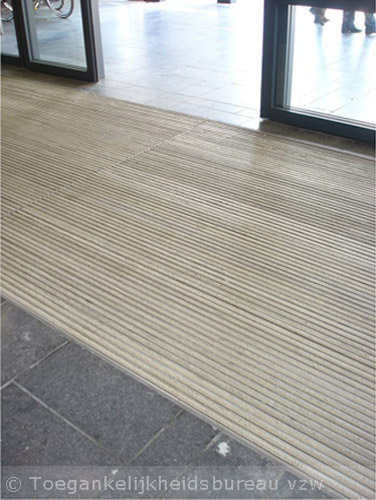 Spiegelende of sterk reflecterende oppervlakken worden vermeden. Op glazen wanden dienen contrastmarkeringen aangebracht te worden, zodat zij zichtbaar en herkenbaar zijn. Contrastmarkeringen worden best aangebracht op drie niveaus (ooghoogte, heuphoogte en vloerniveau) en steeds over de volledige breedte van de wand.